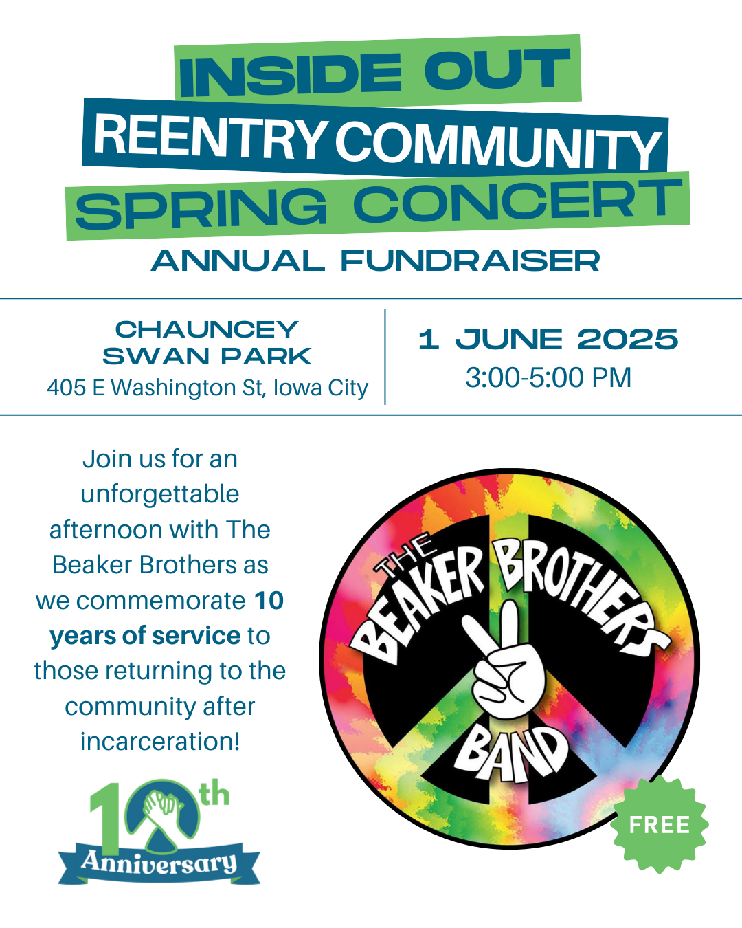 Our Spring Concert is just around the corner! Join us June 1st to celebrate 10 years of service to those returning to the community after incarceration. This family friendly event will have live music by the Beaker Brothers Band, raffle prizes, and snacks!